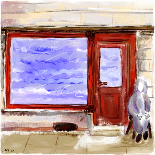 Die alte Frau ohne Gesicht sitzt vor ihrem Ladengeschäft.