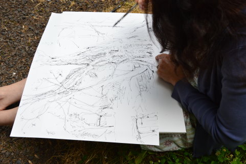 Plötzlich flog etwas vom Baum herab und landete mit einem Peng mitten auf dem Zeichenpapier. Genau bei der sich schnell bewegenden Tuschefeder, die gerade mehrere explodierende Blattsterne produzierte, und landete von dort in einem hohen Bogen im Gras neben der Zeichnung.