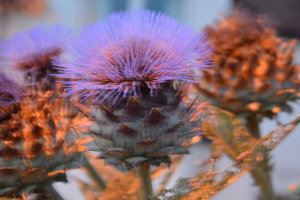 Müde. Distel singt ein Lied. Gras duftet. Purpur.