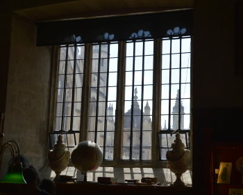 Blick aus und auf altehrwürdiges Gemäuer: die Bibliothek