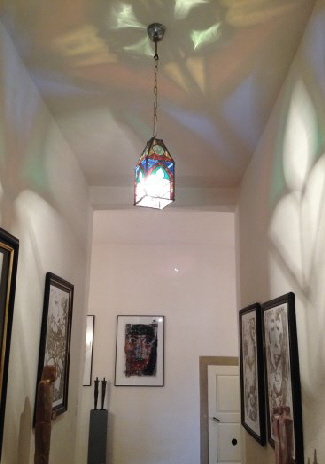 Und die schrägstehende Herbstmorgensonne hat drinnen schwebende rosafarbende und hellgrüne Lichter kunstvoll auf ihre bunten Wände gemalt!