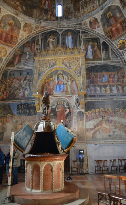 Das Kleinod stammt aus dem 12. Jahrhundert und ihr Innenraum wurde im 14. Jahrundert von Giusto de Menbouoi ganz und gar mit eher naiv wirkenden, farbenprächtigen Fresken ausgeschmückt, als wäre sie ein einziges Bilderbuch.